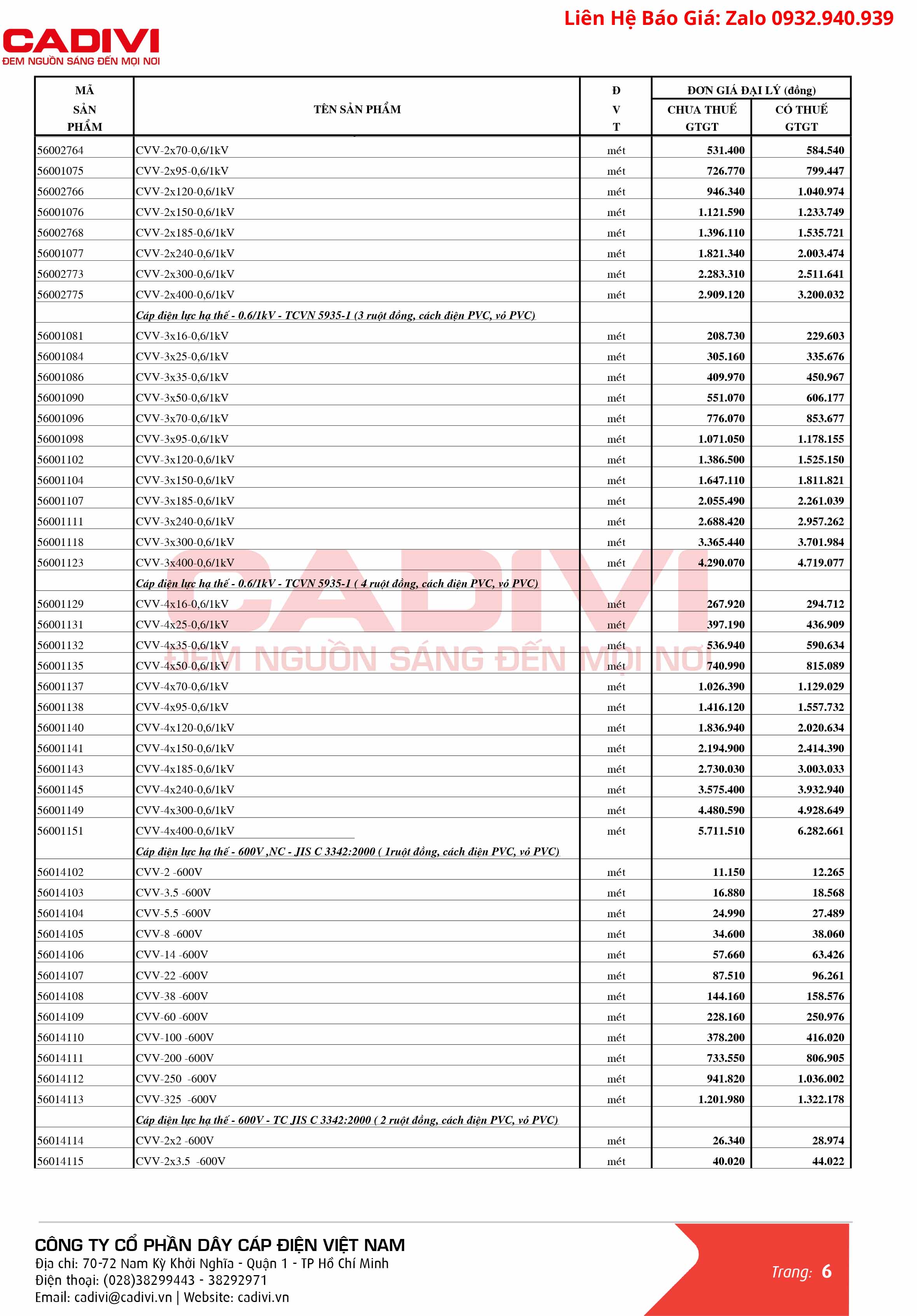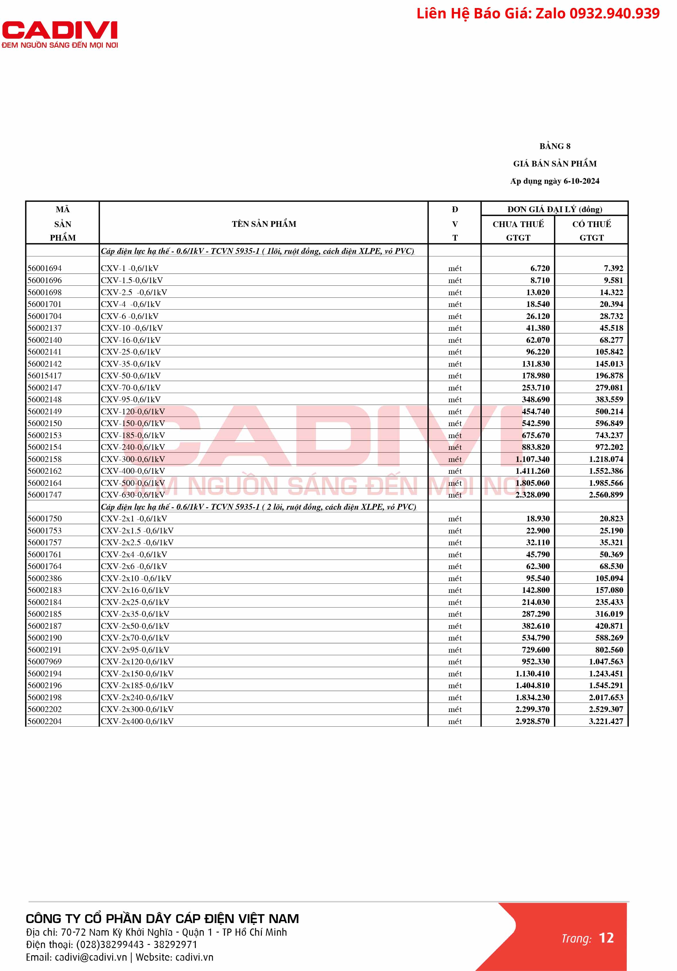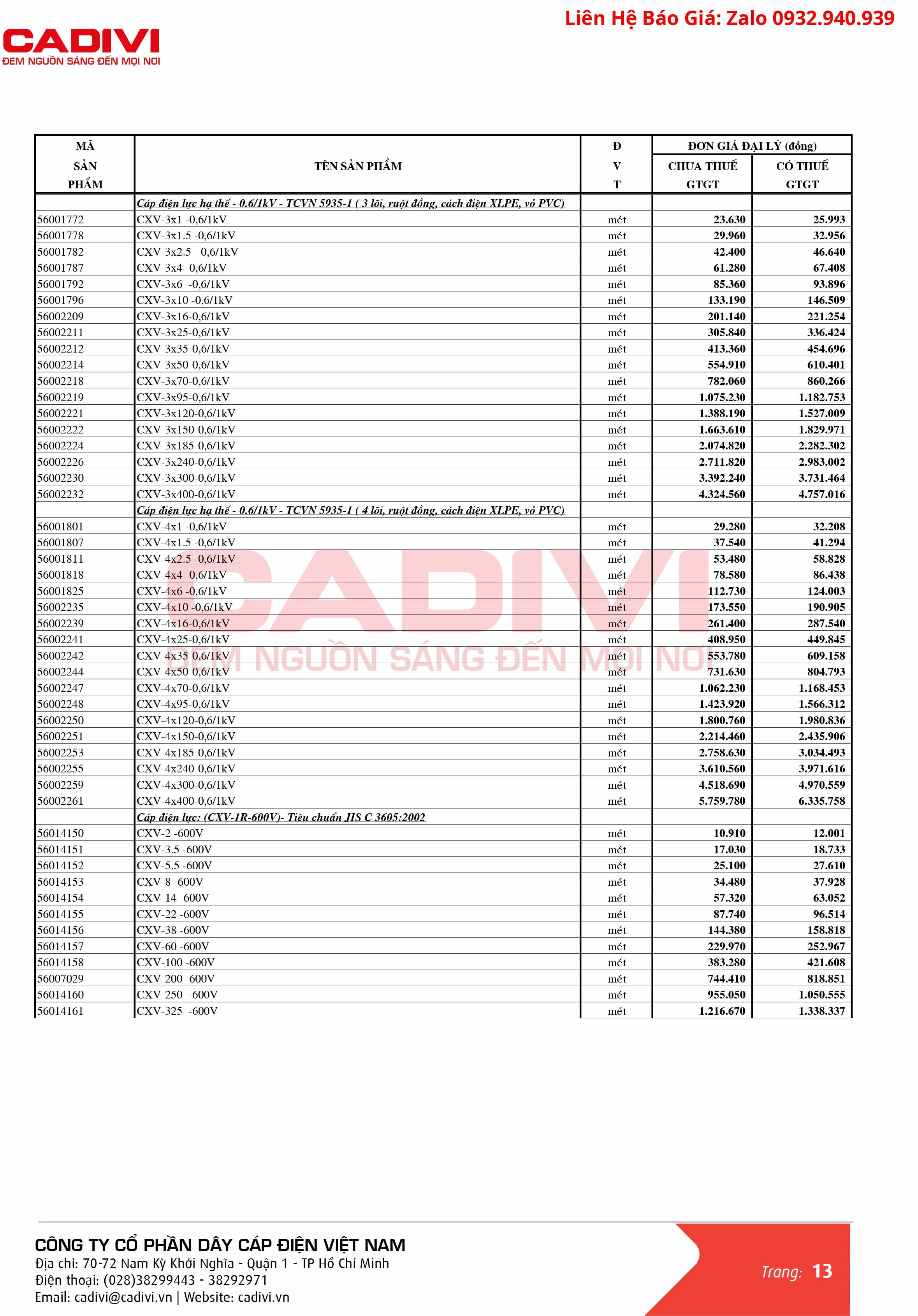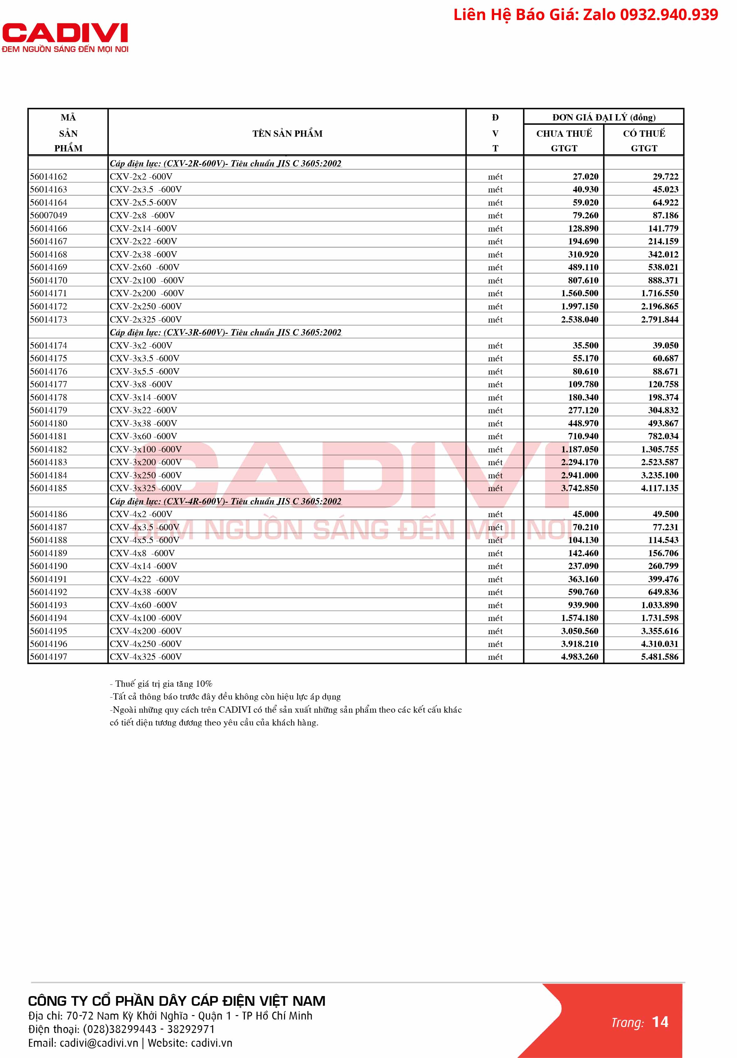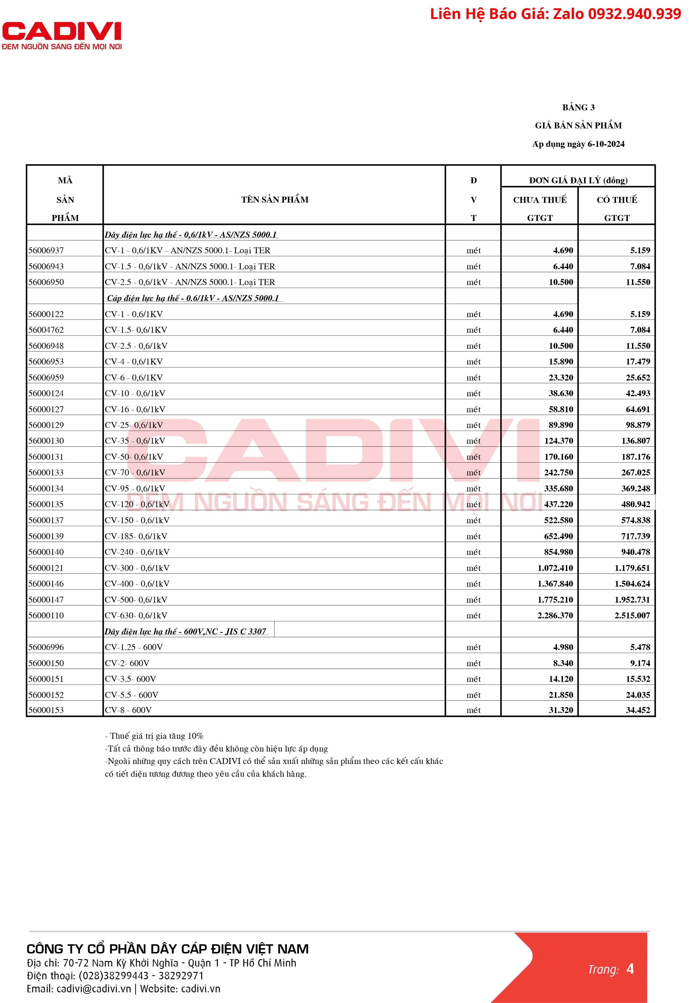 Liên hệ cho chúng tôi Zalo 0932.940.939 , hoặcGọi điện 0932940939 để được Báo giá dây cáp điện Cadivi nhanh nhất