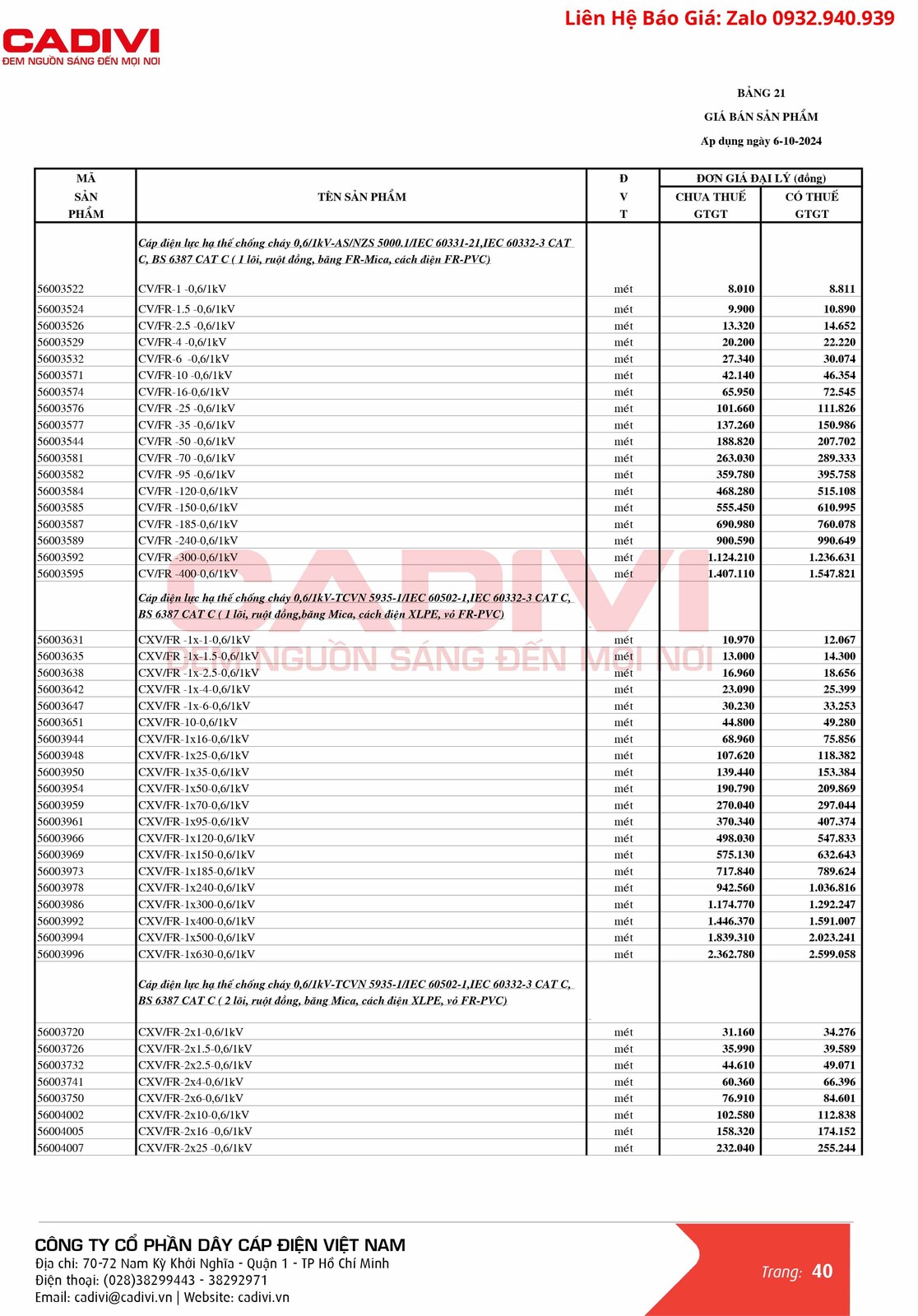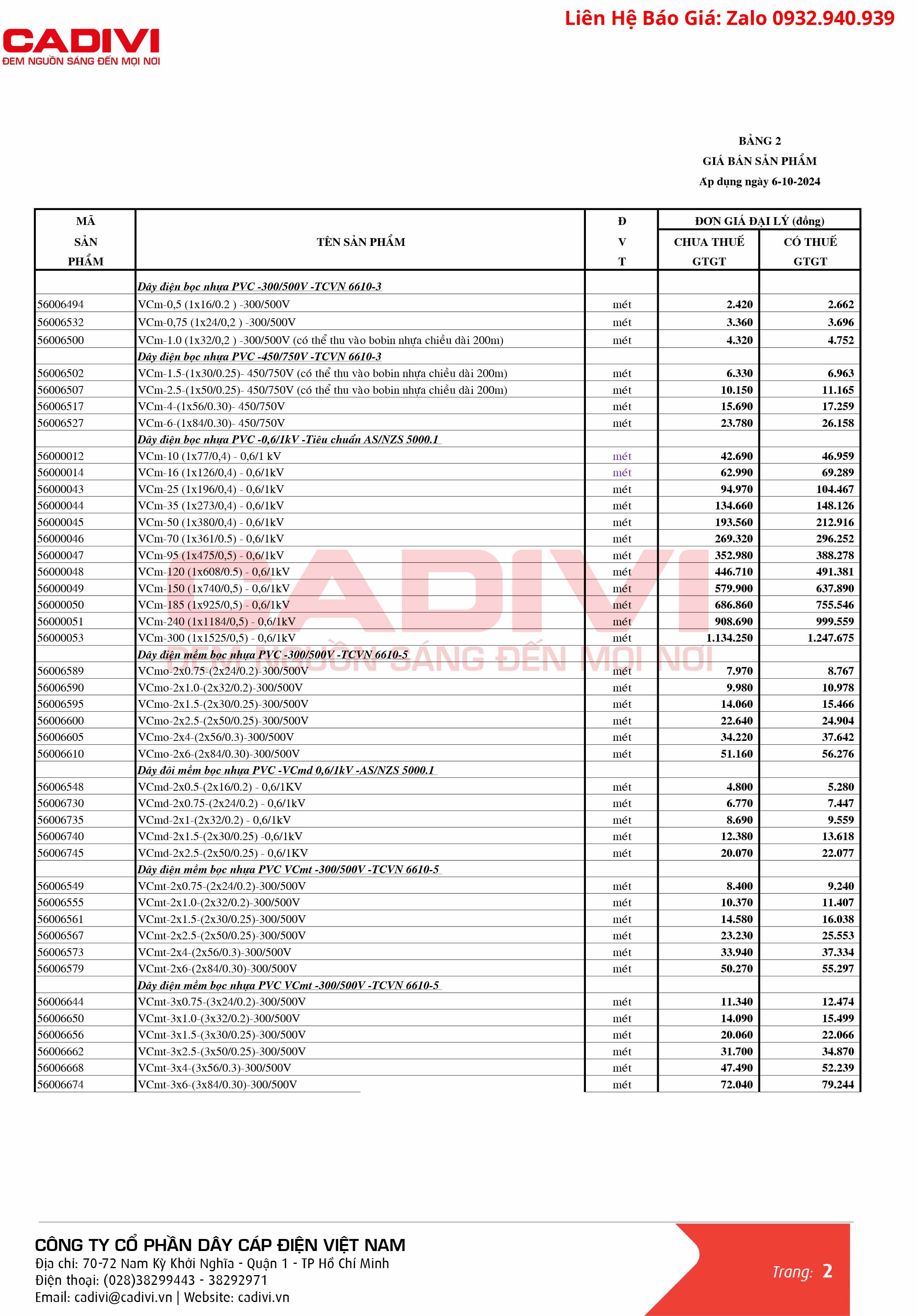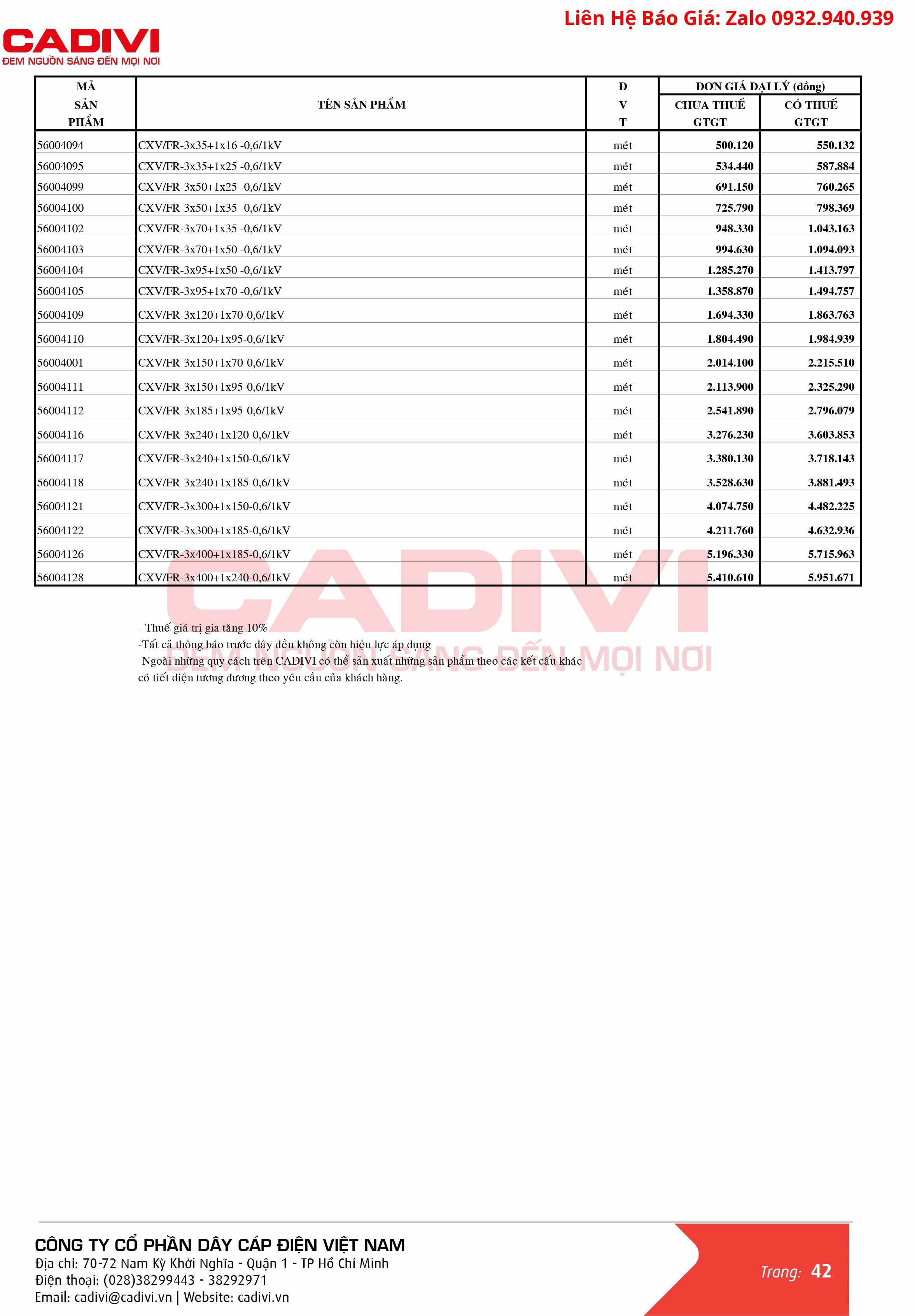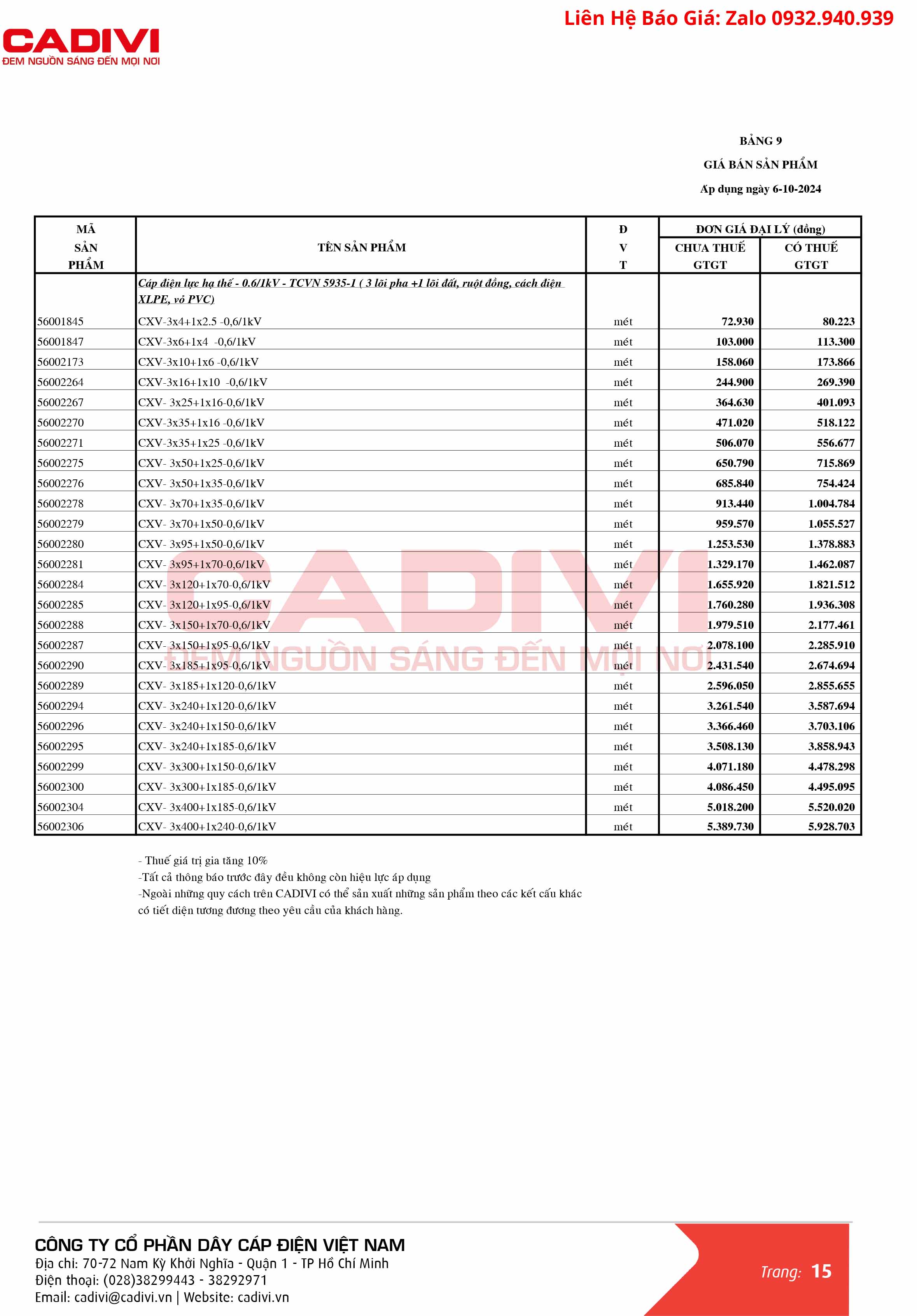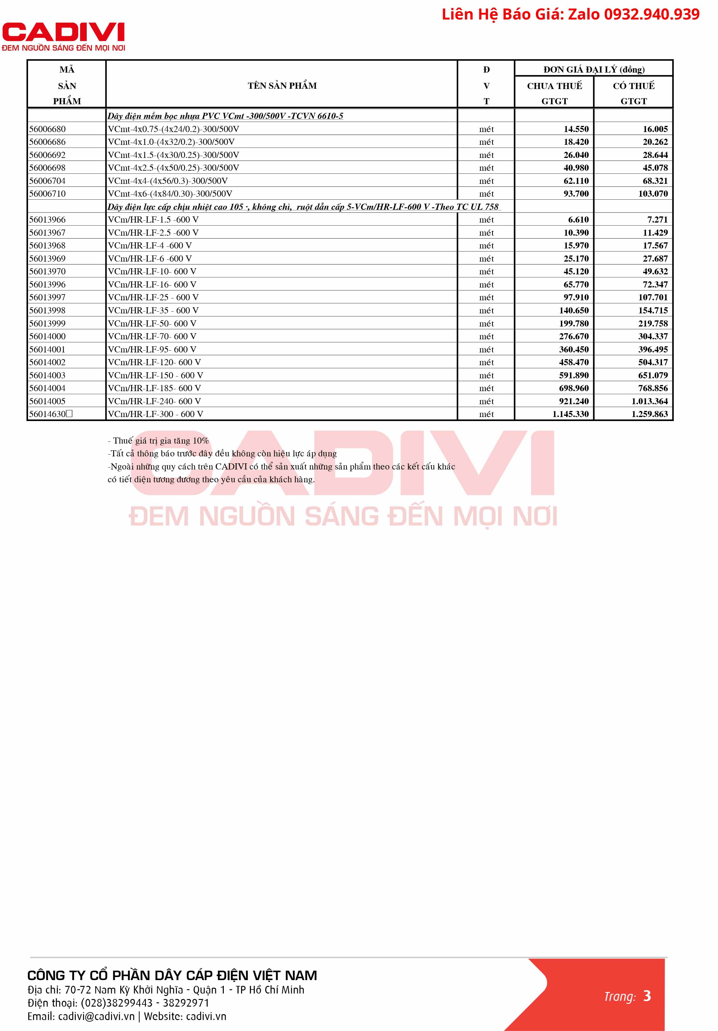 Liên hệ cho chúng tôi Zalo 0932.940.939 , hoặcGọi điện 0932940939 để được Báo giá dây cáp điện Cadivi nhanh nhất