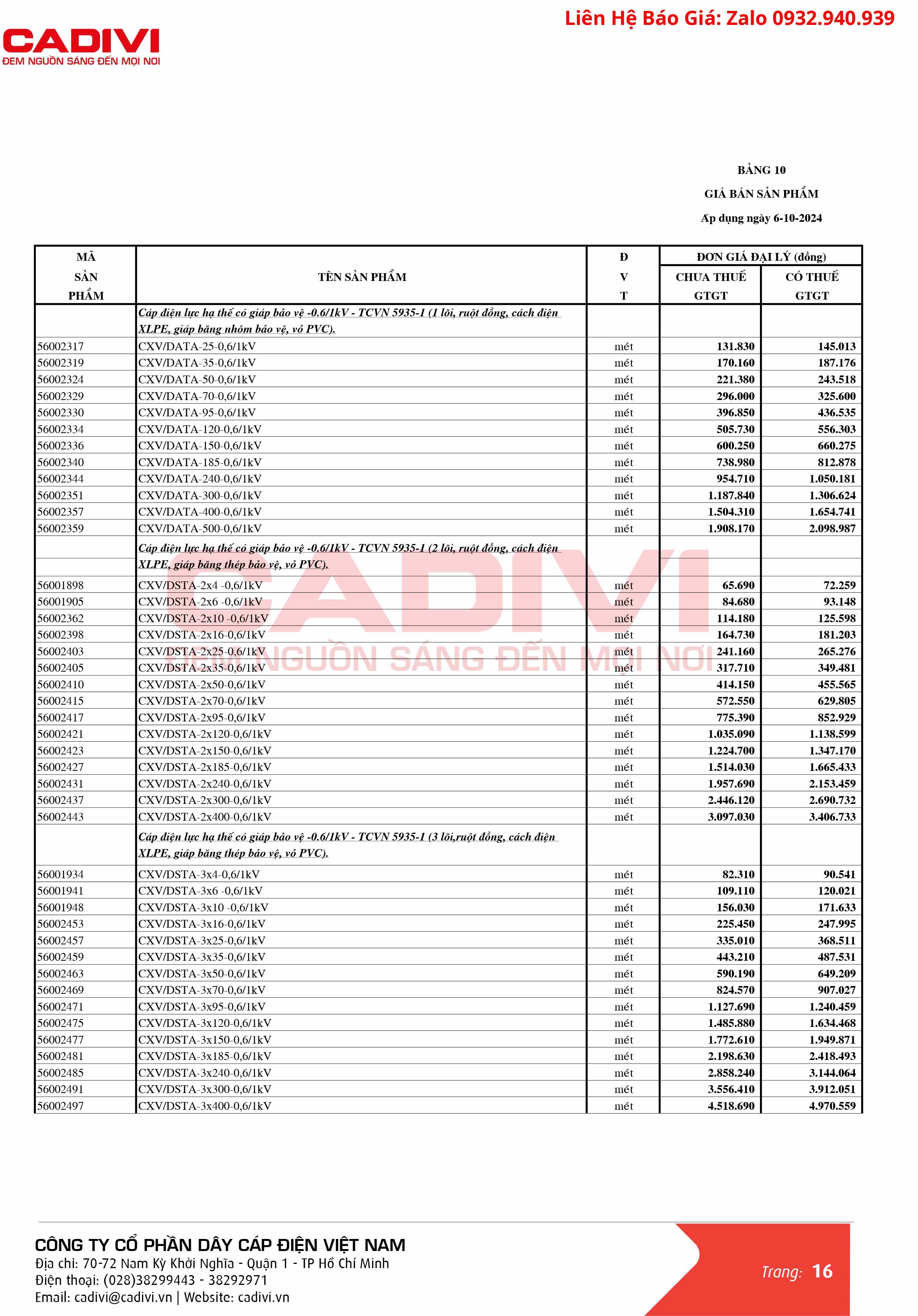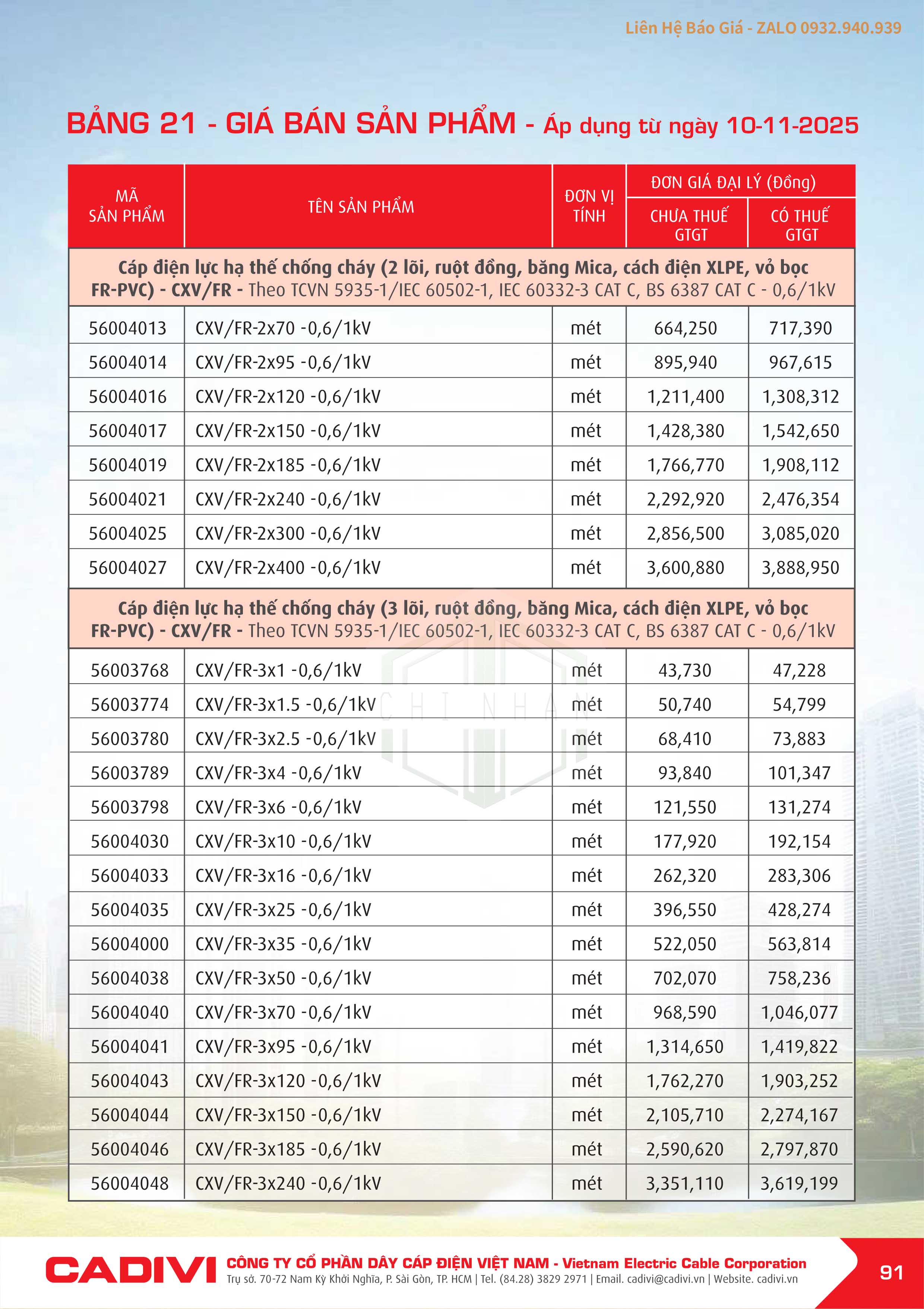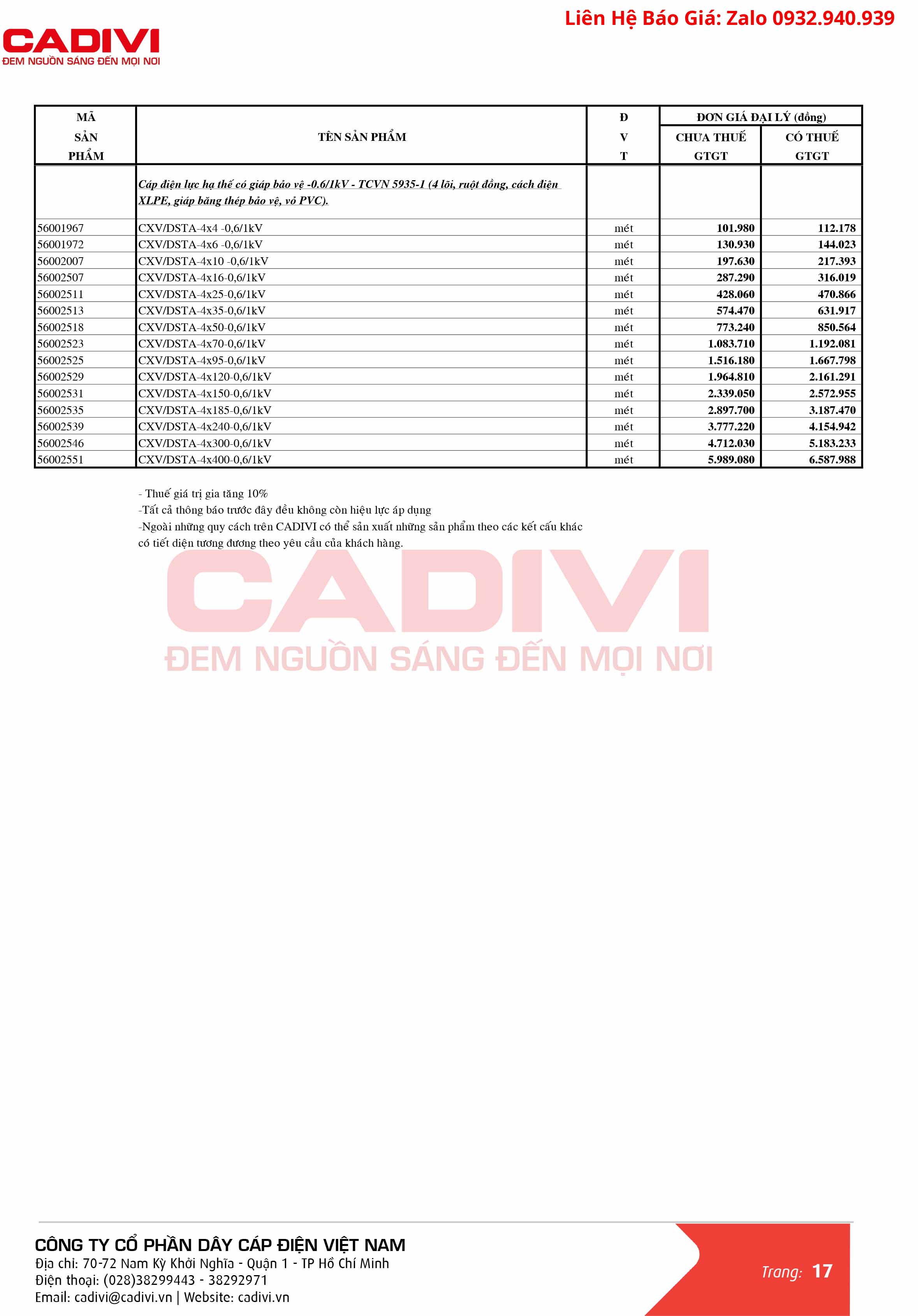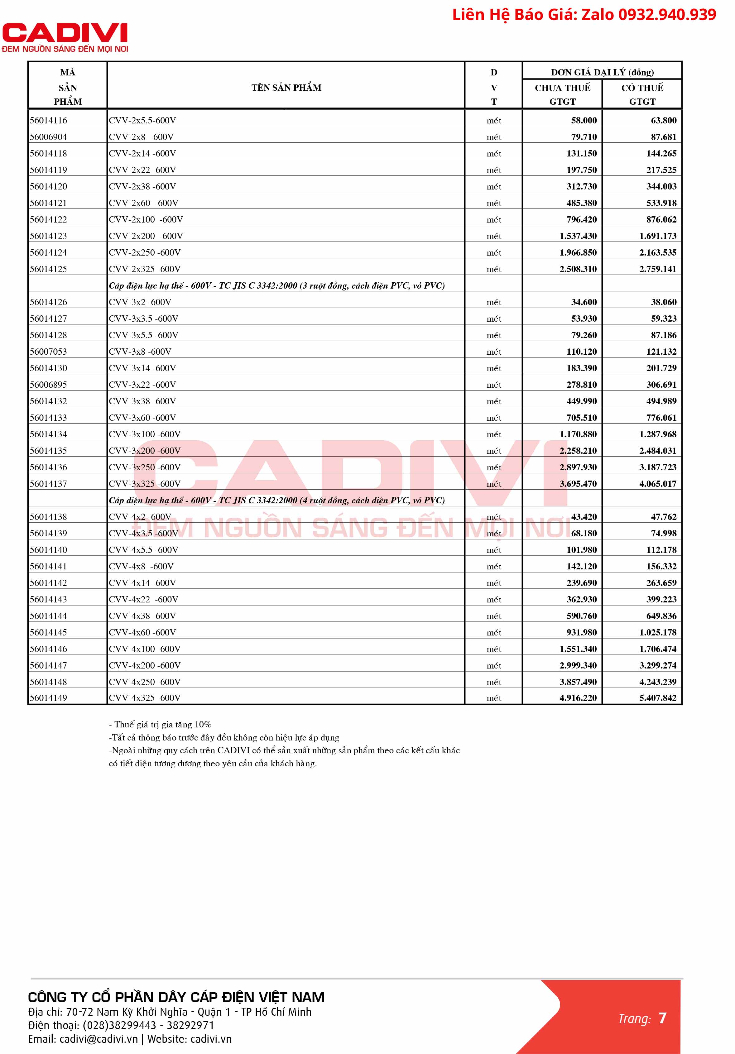Liên hệ cho chúng tôi Zalo 0932.940.939 , hoặcGọi điện 0932940939 để được Báo giá dây cáp điện Cadivi nhanh nhất