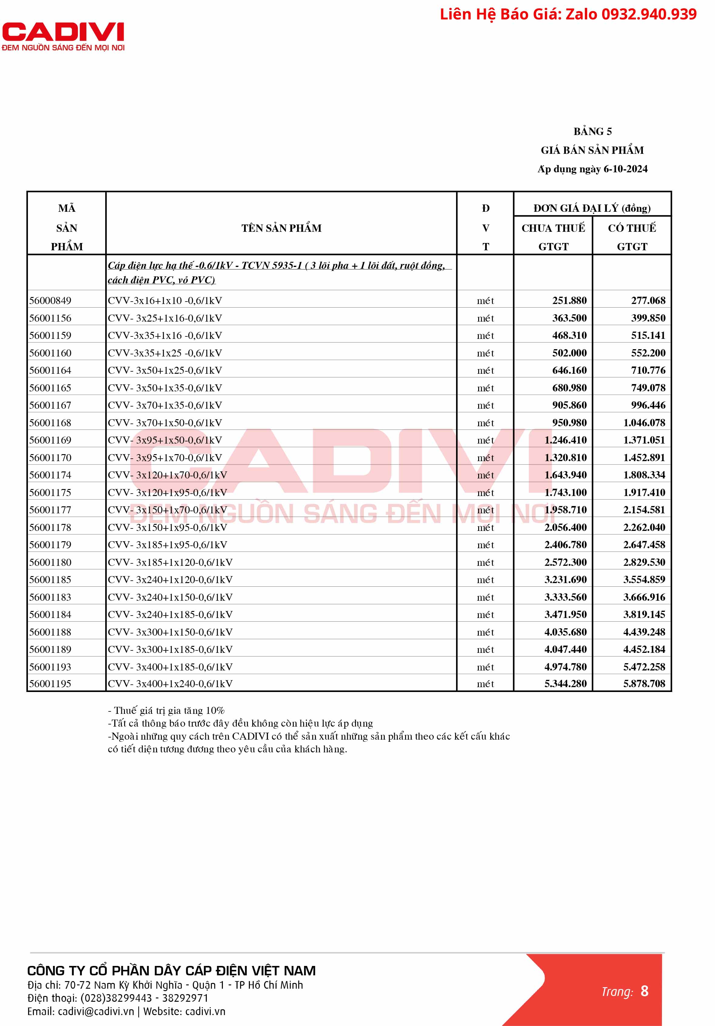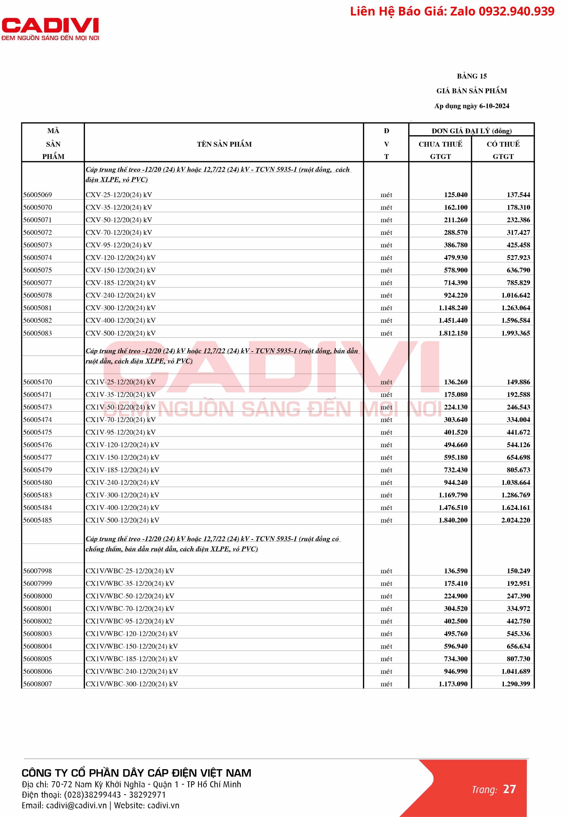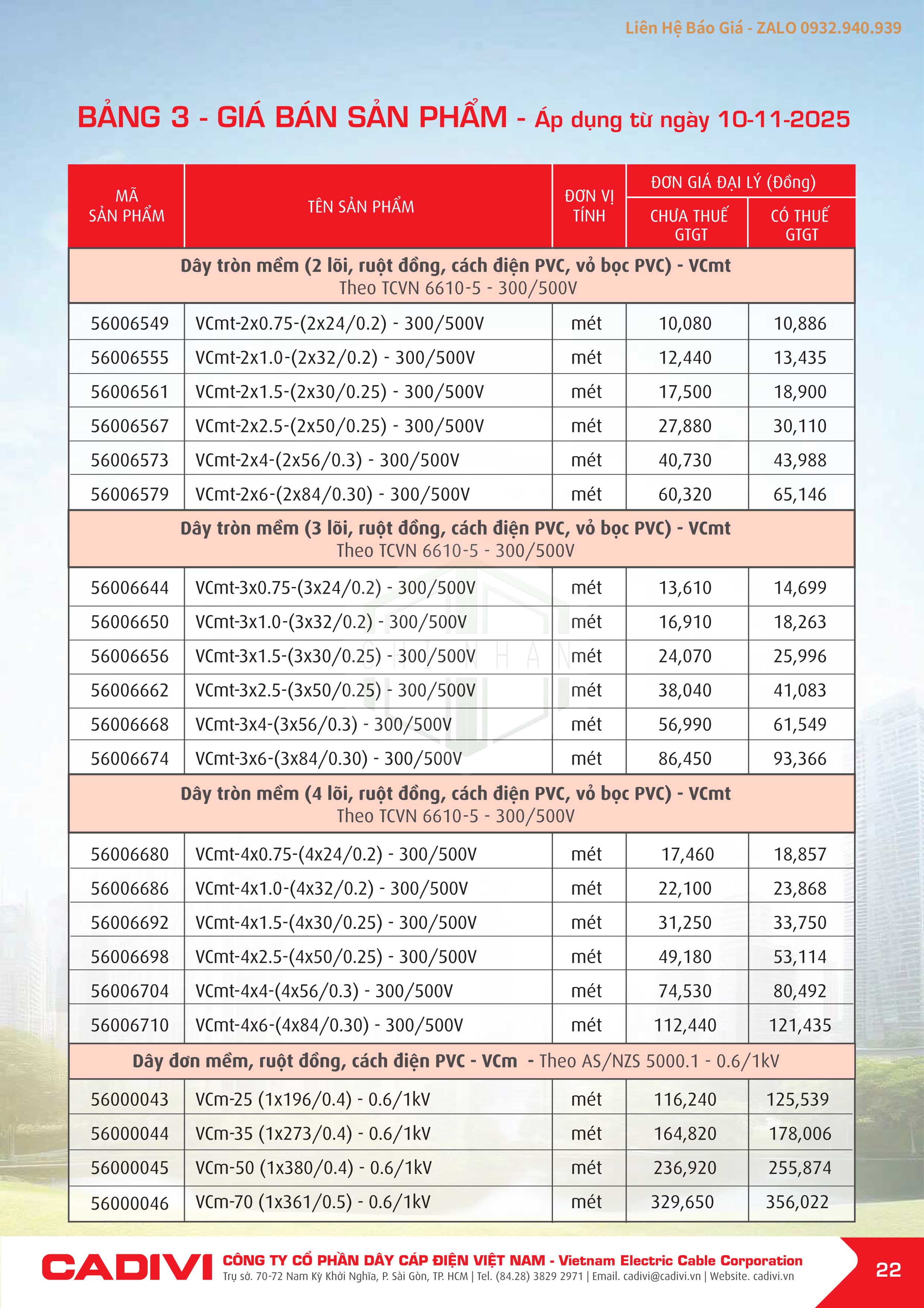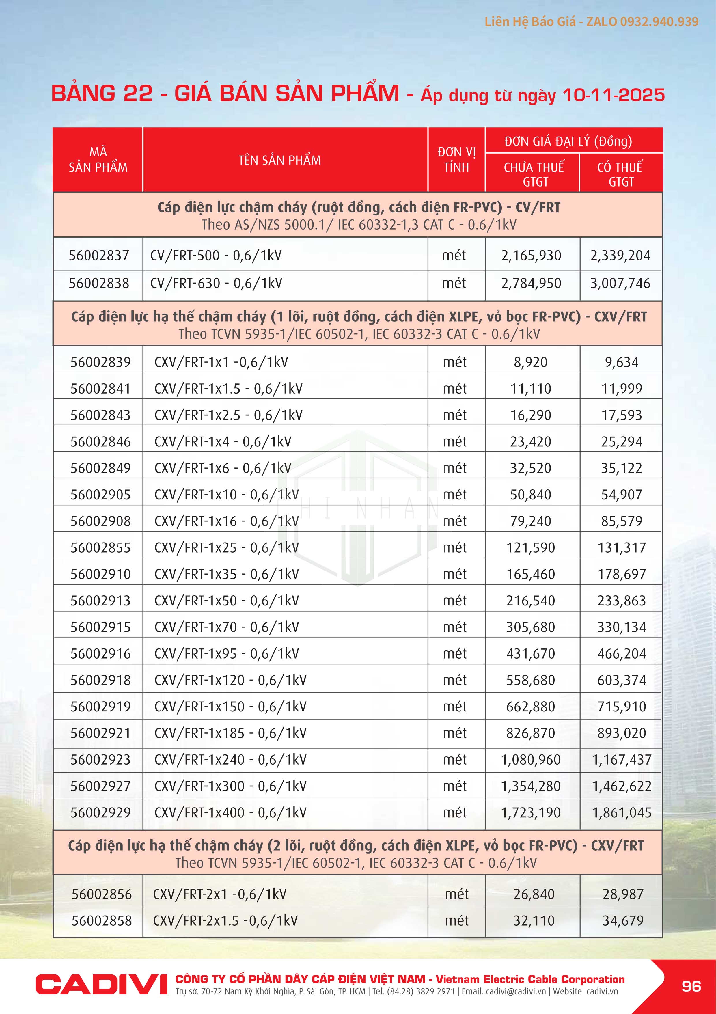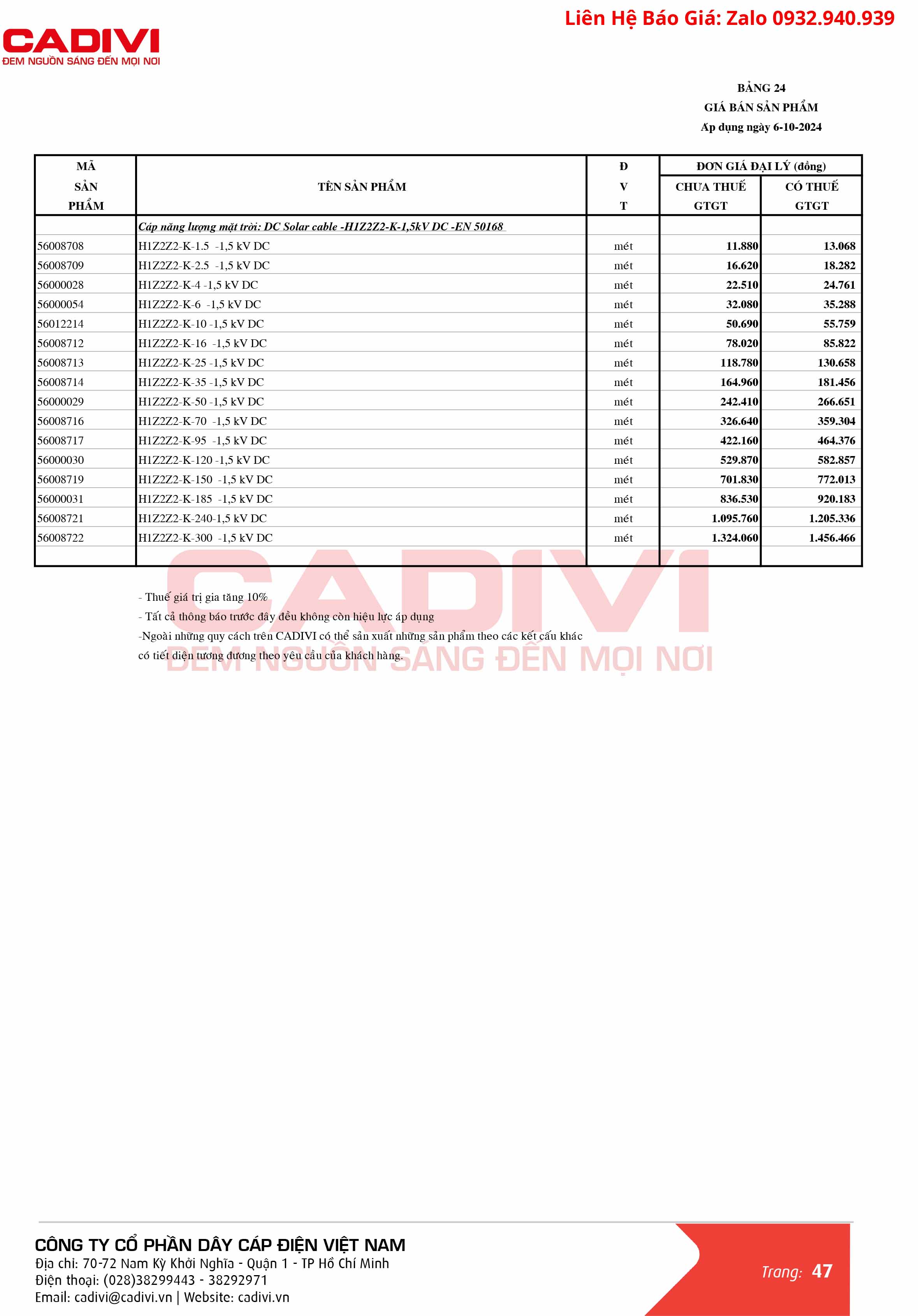 Liên hệ cho chúng tôi Zalo 0932.940.939 , hoặcGọi điện 0932940939 để được Báo giá dây cáp điện Cadivi nhanh nhất