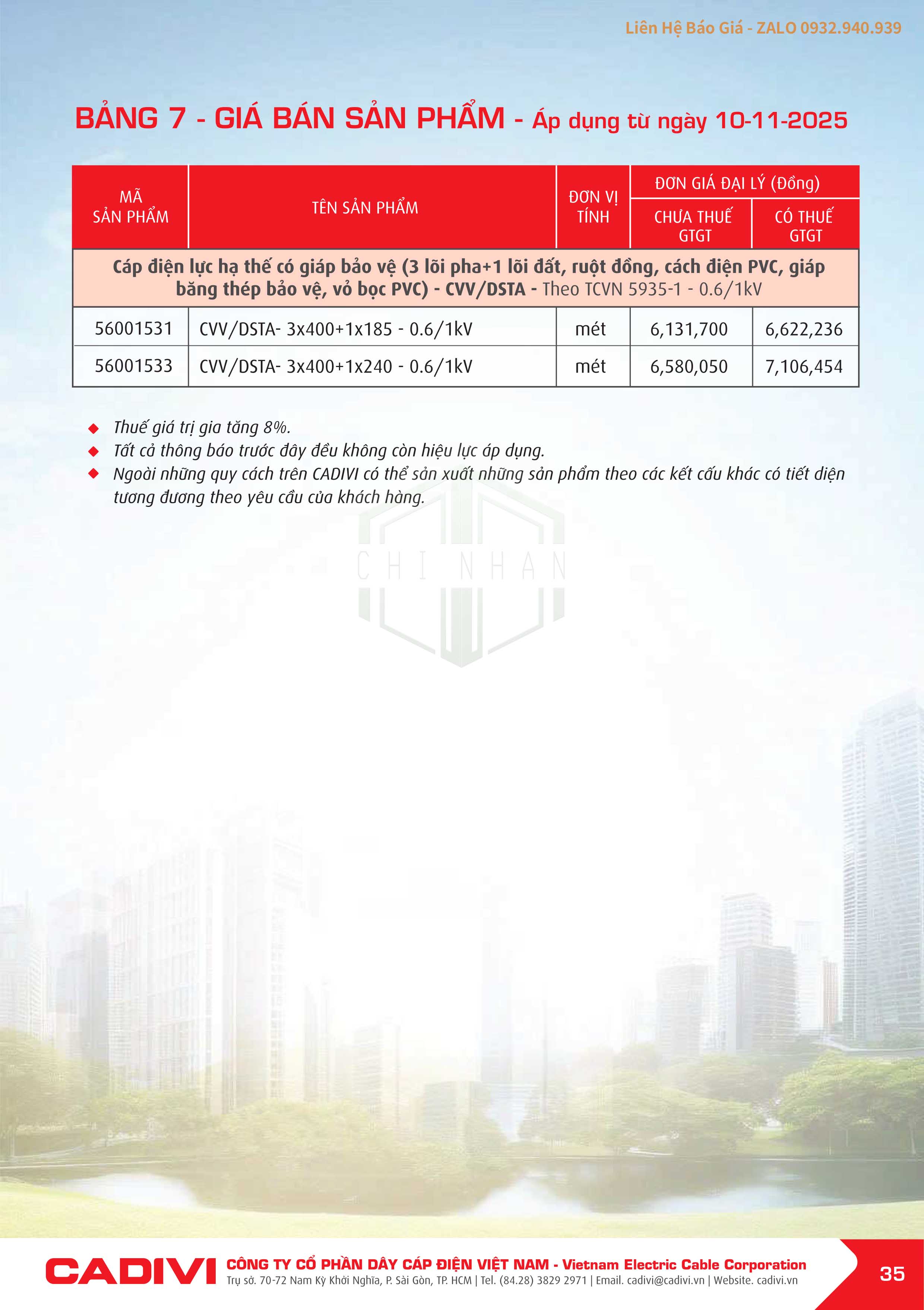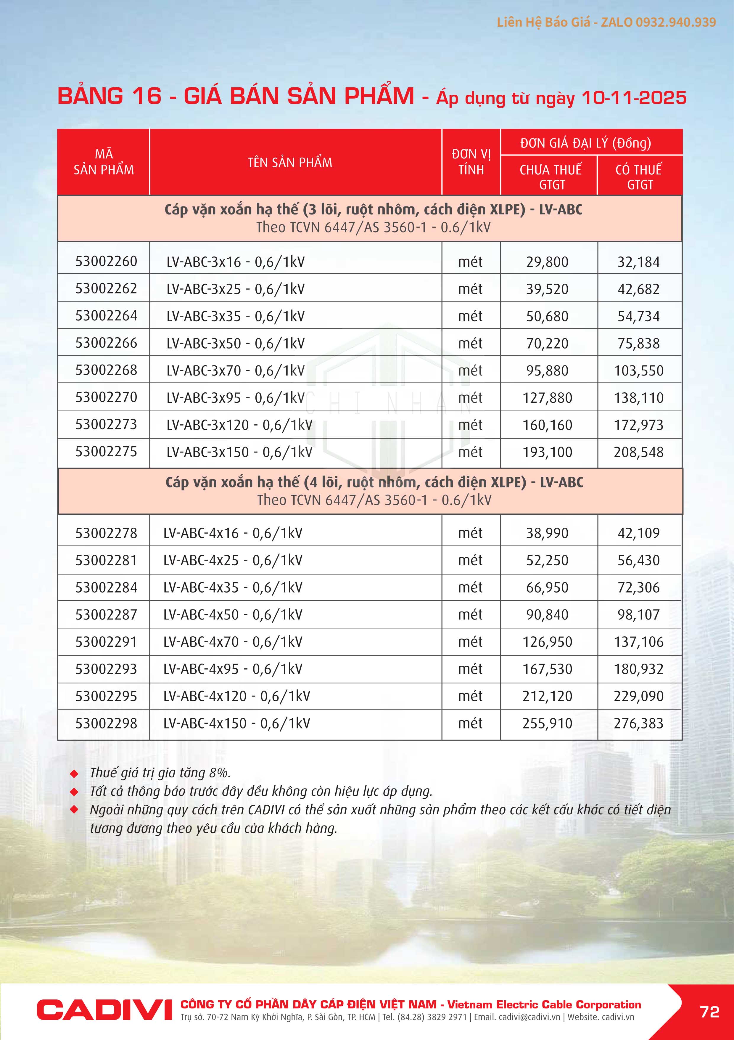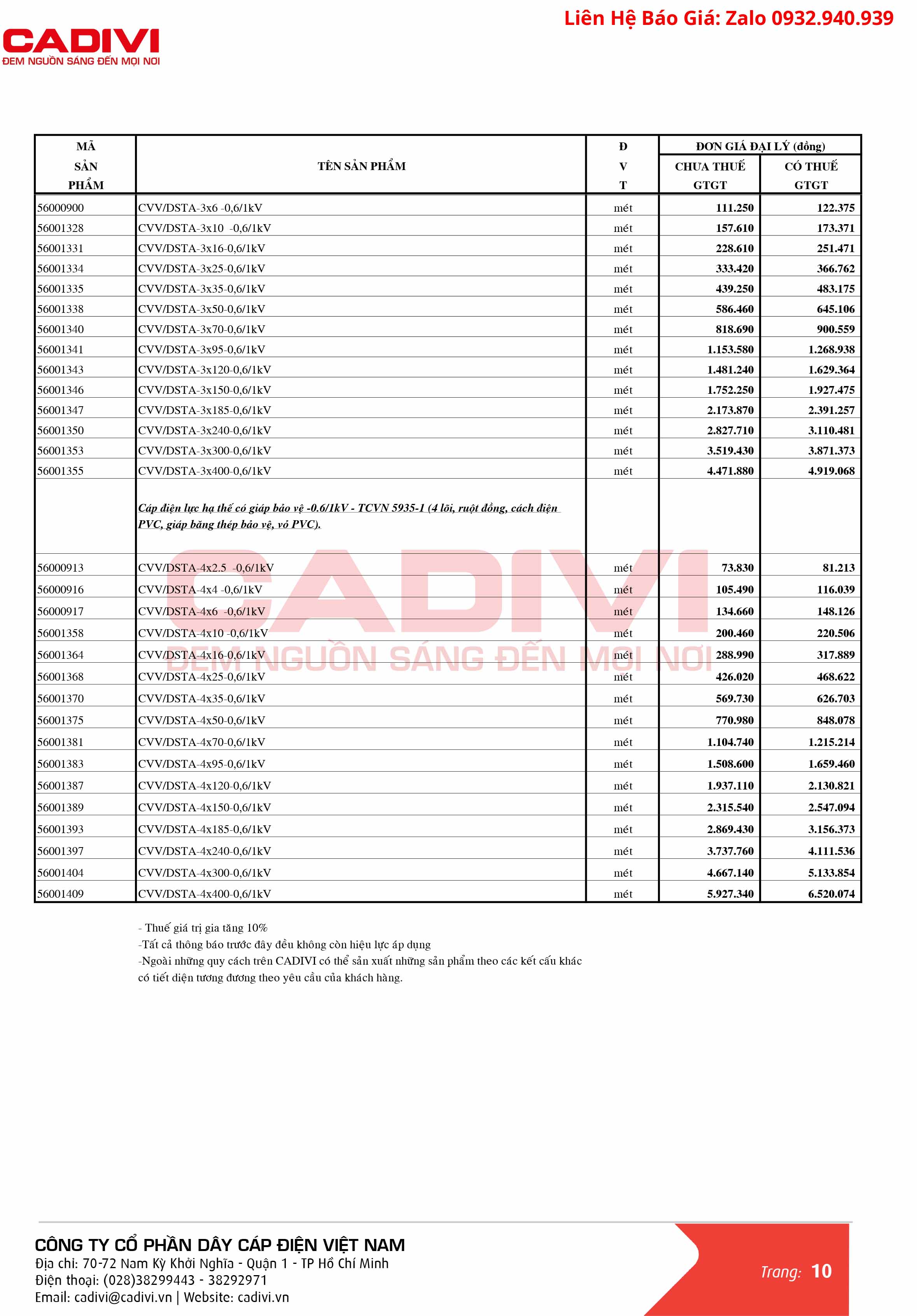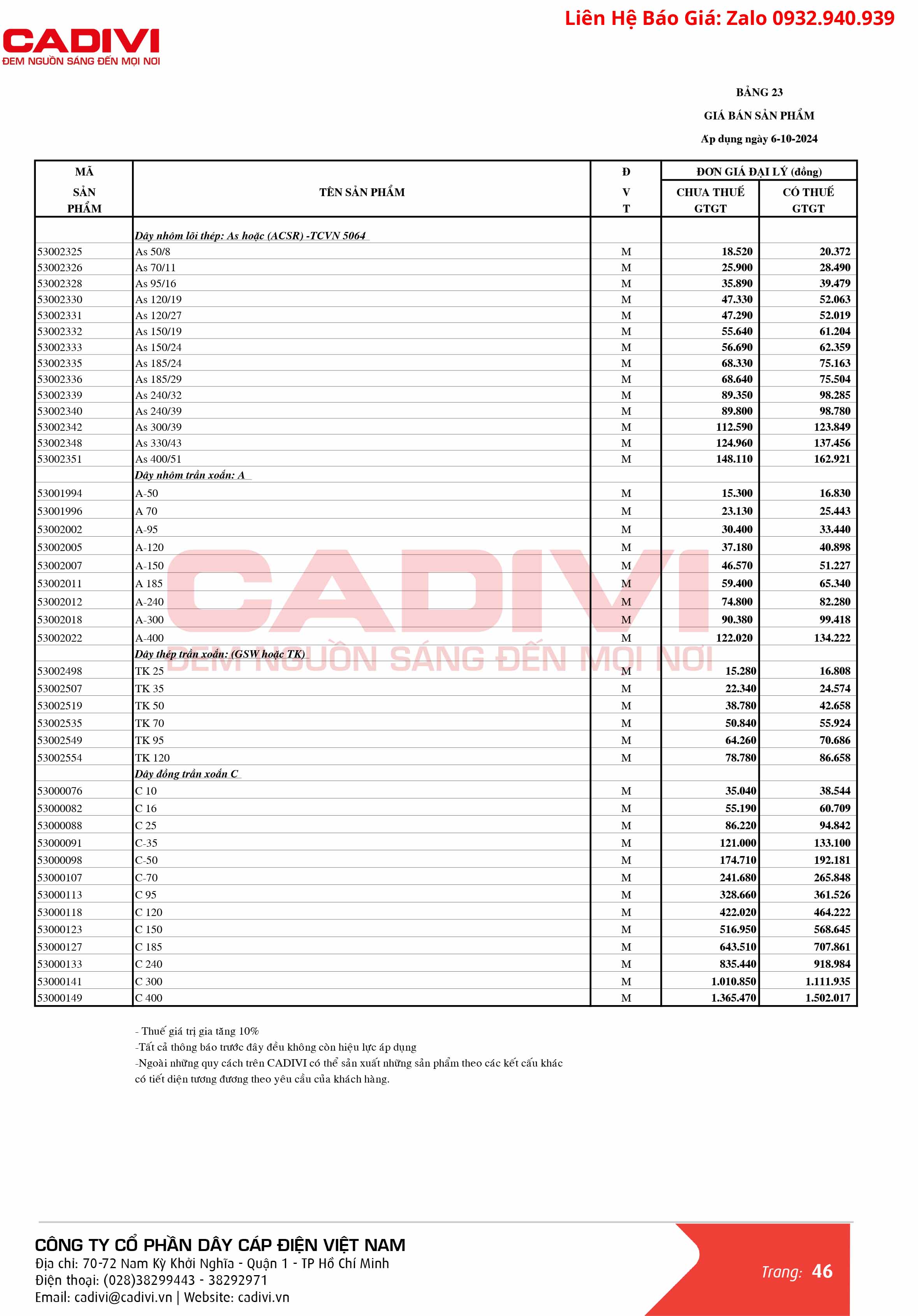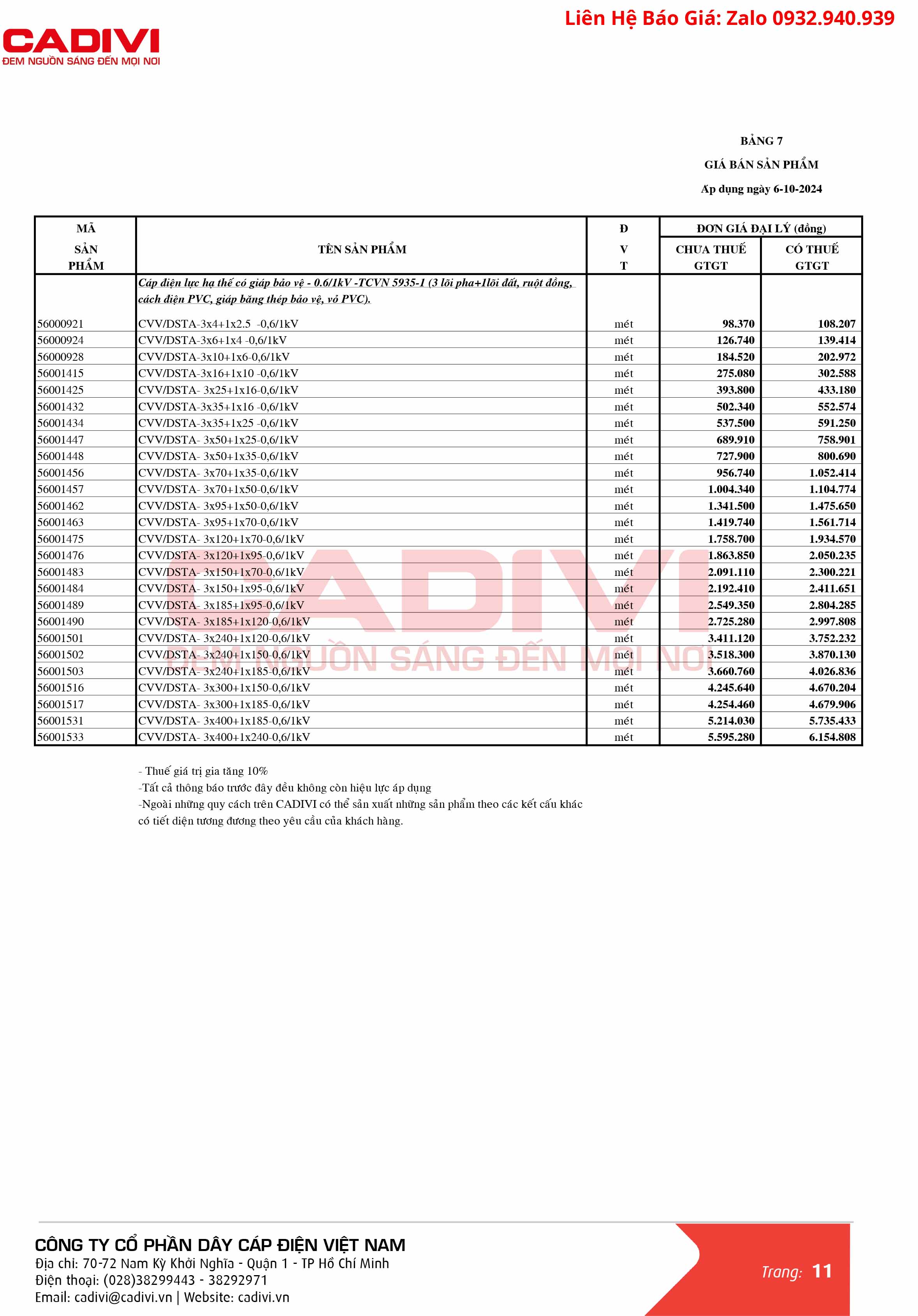 Liên hệ cho chúng tôi Zalo 0932.940.939 , hoặcGọi điện 0932940939 để được Báo giá dây cáp điện Cadivi nhanh nhất