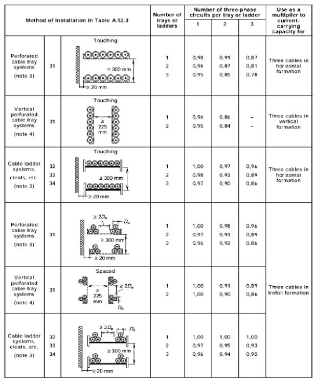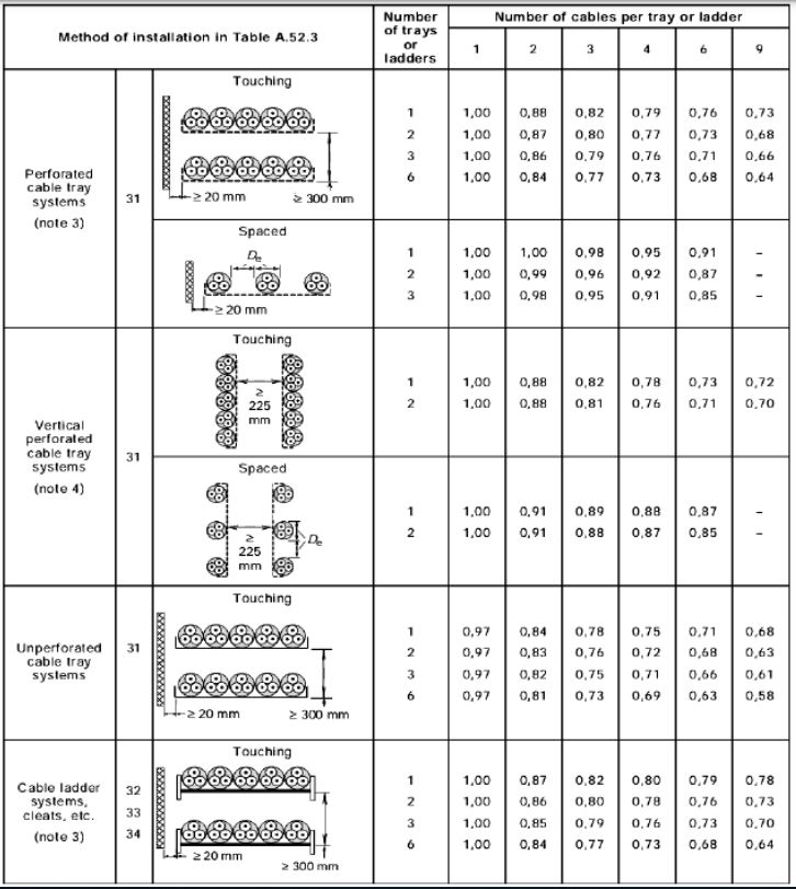 Tham khảo các bảng dưới đây trong tiêu chuẩn BS 7671, chúng ta có thể tìm thấy các hệ số giảm tốc cho cả hai trường hợp: Cáp được nhóm lại với nhau và các cáp được đặt cách nhau.
