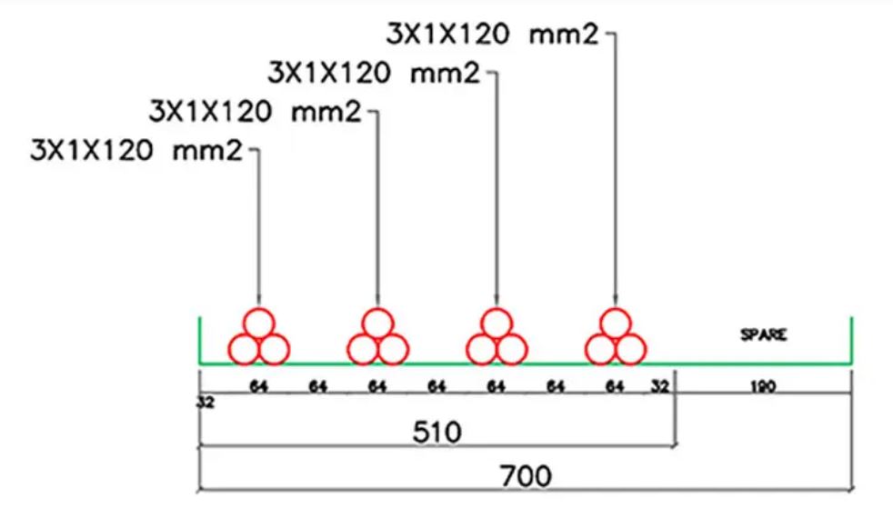 - Khoảng cách giữa loại cáp dạng xếp chồng ở ví dụ 2 (trefoil) sẽ = đường kính x2 của cáp lớn hơn.